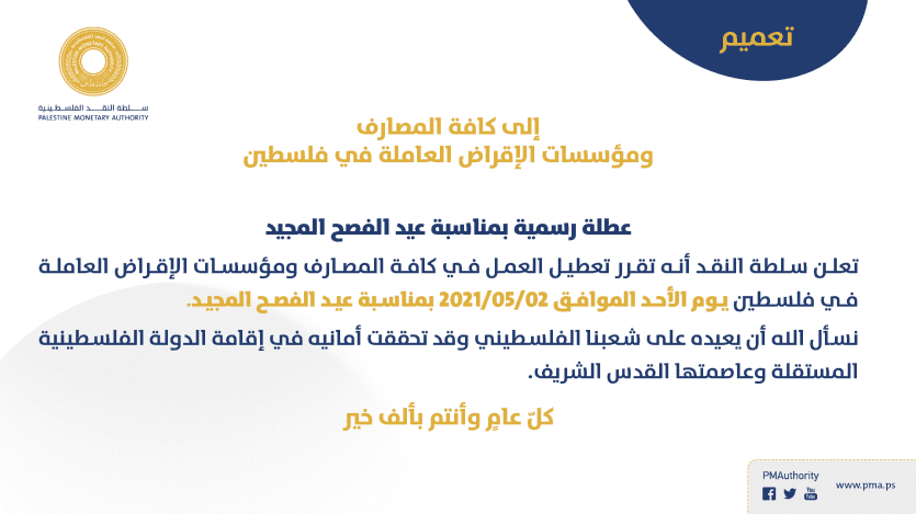 أعلنت سلطة النقد الفلسطينية اليوم الخميس، عن تعطيل العمل في المصارف ومؤسسات الإقراض يوم الأحد المقبل الموافق 02/05/2021 لمناسبة عيد الفصح المجيد، وفقا لقرار سابق أصدرته الحكومة.