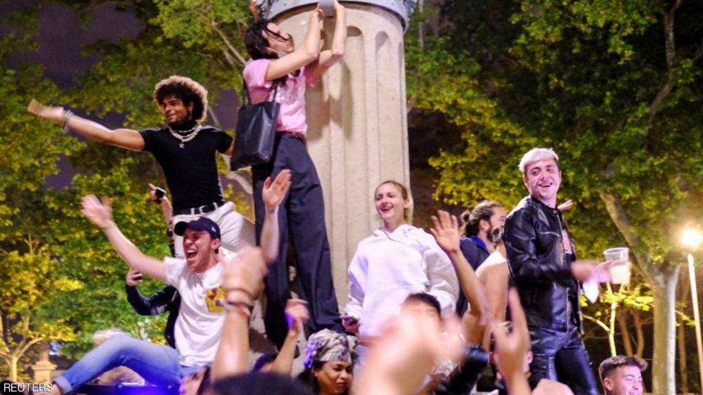 وسط مشاعر فرح غامر رقص الإسبان في الشوارع، ورددوا هتاف "حرية"، وأقاموا احتفالات على الشواطئ ليلا، بمناسبة انتهاء حظر التجول الرامي لمكافحة فيروس كورونا في معظم أنحاء إسبانيا.