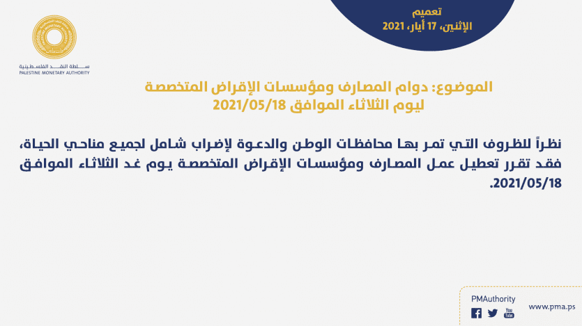 وقالت سلطة النقد في بيان لها: "نظرا للظروف التي تمر بها محافظات الوطن والدعوة لإضراب شامل لجميع مناحي الحياة، فقد تقرر تعطيل عمل المصارف ومؤسسات الإقراض المتخصصة يوم غد الثلاثاء".