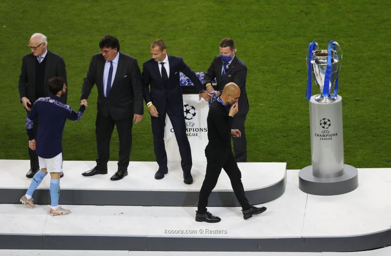 تسلم جوارديولا الميدالية الفضية الخاصة به وقام بتقبيلها، وكأنه راض عن خسارة فريقه أو ربما يرى أن المركز الثاني كافيا لطموح السيتي.