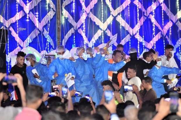 تداول رواد موقع التواصل الاجتماعي "فيسبوك"، مجموعة من الصور تظهر عددا من الحضور في فرح شعبي يرتدون ملابس العزل المخصصة لأقسام العزل في المستشفيات للوقاية من فيروس كورونا.