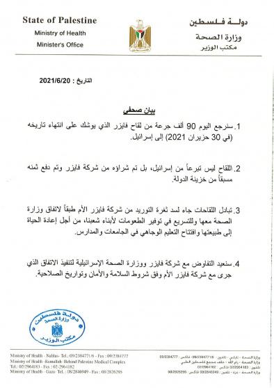 3. تبادل اللقاحات جاء لسد ثغرة التوريد من شركة فايزر الأم طبقاً لاتفاق وزارة الصحة معها وللتسريع في توفير الطعومات لأبناء شعبنا، من أجل إعادة الحياة إلى طبيعتها وافتتاح التعليم الوجاهي في الجامعات والمدارس.