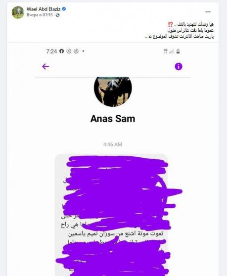 وكشف عن اسم الحساب الذي أرسل التهديد عبر رسائل "فيسبوك"، وقام بالتغطية على جانب كبير من فحوى الرسالة، كاشفا فقط عن عبارة التهديد بالقتل وتقول: "ياسمين راح تموت موتة أشنع من سوزان تميم".