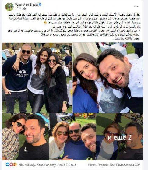 وأضاف وائل عبر حسابه بموقع الفيس بوك: حق الرد علي موضوع الاستاذة المحترمة بنت الناس المحترمين الاستاذ محمد حلاوه .. يا استاذه ليلي ده عيد ميلاد سيف ابن اختي وكان بعد طلاق ياسمين بمده طويله بحضور صحاب كتيره وشهود علي وجودك انا بقي مش عارف هو حضرتك كنتي فرحانه في الصور معانا عشان فرحتنا وبتحبينا زي ما كنتي طول عمرك بتقولي والا لرجوع والدك اللي احنا خاطفينه منك الصراحة".