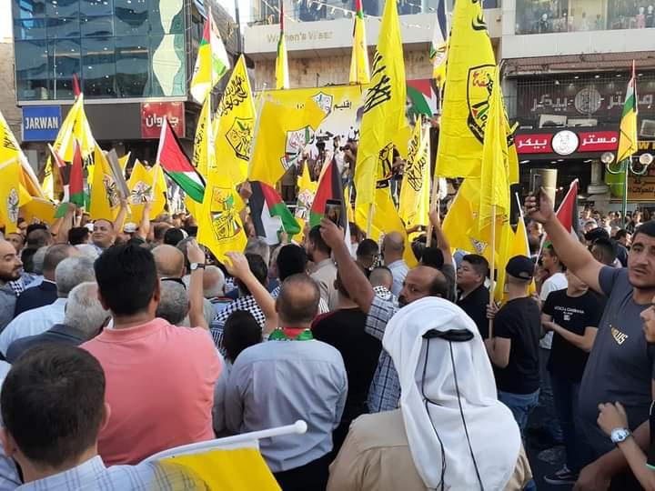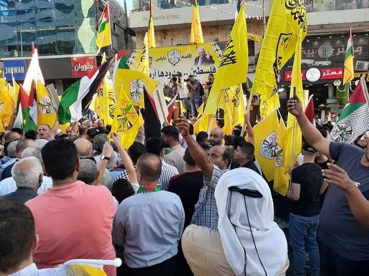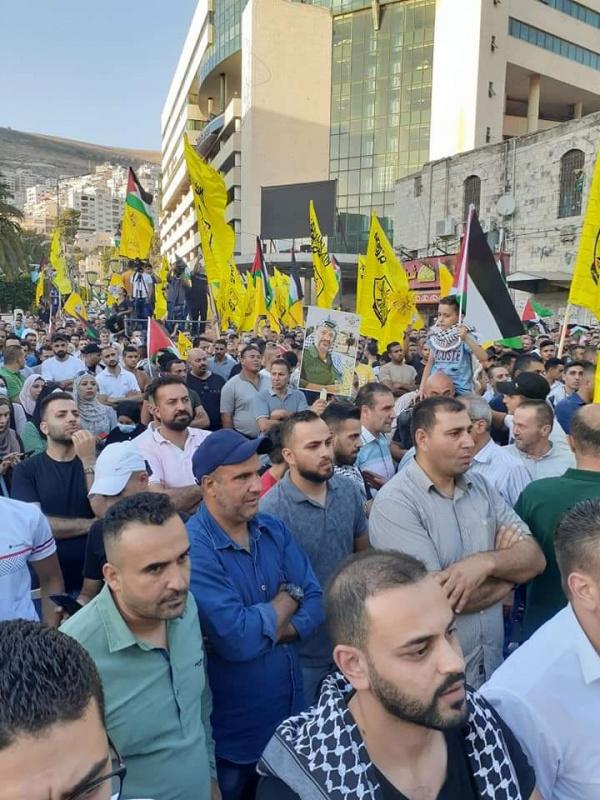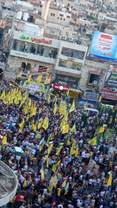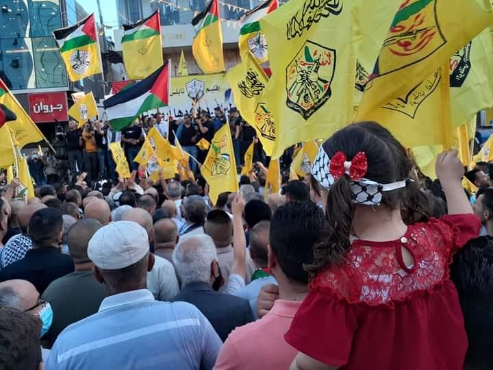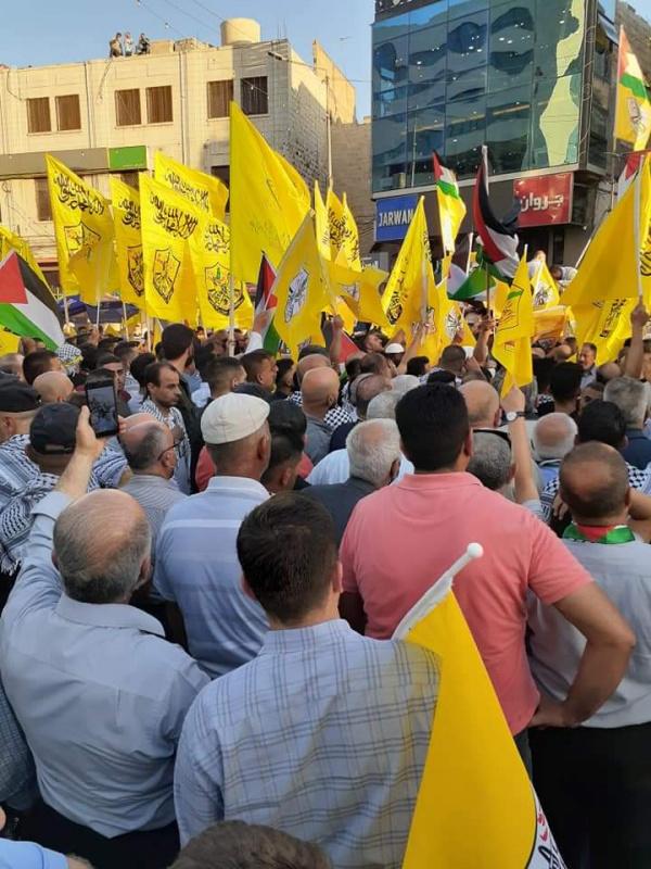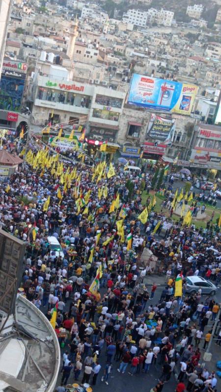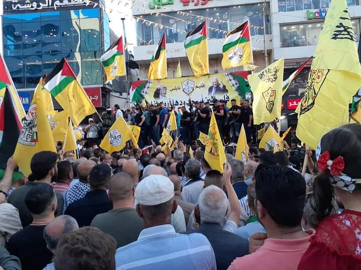 وشارك بالمهرجان آلاف المواطنين الفلسطينيين في محافظة نابلس على دوار الشهداء استجابة لدعوة وجهتها حركة فتح دعما للشرعية الفلسطينية ونصرة للمؤسسة الأمنية الفلسطينية وتطبيق القانون دون مصالح.