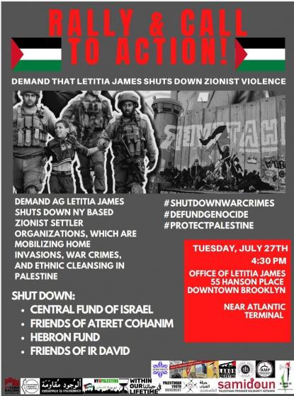 وقال التحالف في بيان له، إن التظاهرة تهدف للضغط على المدعية العامة جونز لاتخاذ اجراءات بإغلاق ومحاكمة القائمين على أربع منظمات استيطانية تتخذ من مدينة نيويورك مركزا لها، وهي منظمات: الموازنة المركزية لإسرائيل، واصدقاء عطيرات كوهانيم، ومنظمة تمويل البؤرة الاستيطانية في الخليل، ومنظمة اصدقاء ديفيد.