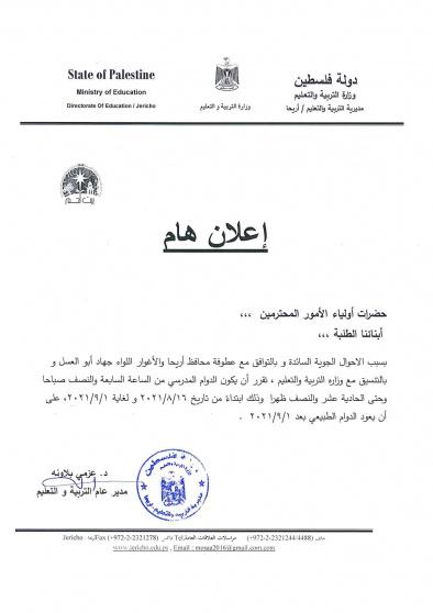 وأوضحت المديرية في بيان لها، أن الدوام المدرسي سيعود إلى طبيعته بتاريخ 1 / 9 / 2021، مشيرة إلى أن القرار تم بالتوافق مع محافظ أريحا والأغوار جهاد أبو العسل وبالتنسيق مع وزارة التربية والتعليم.