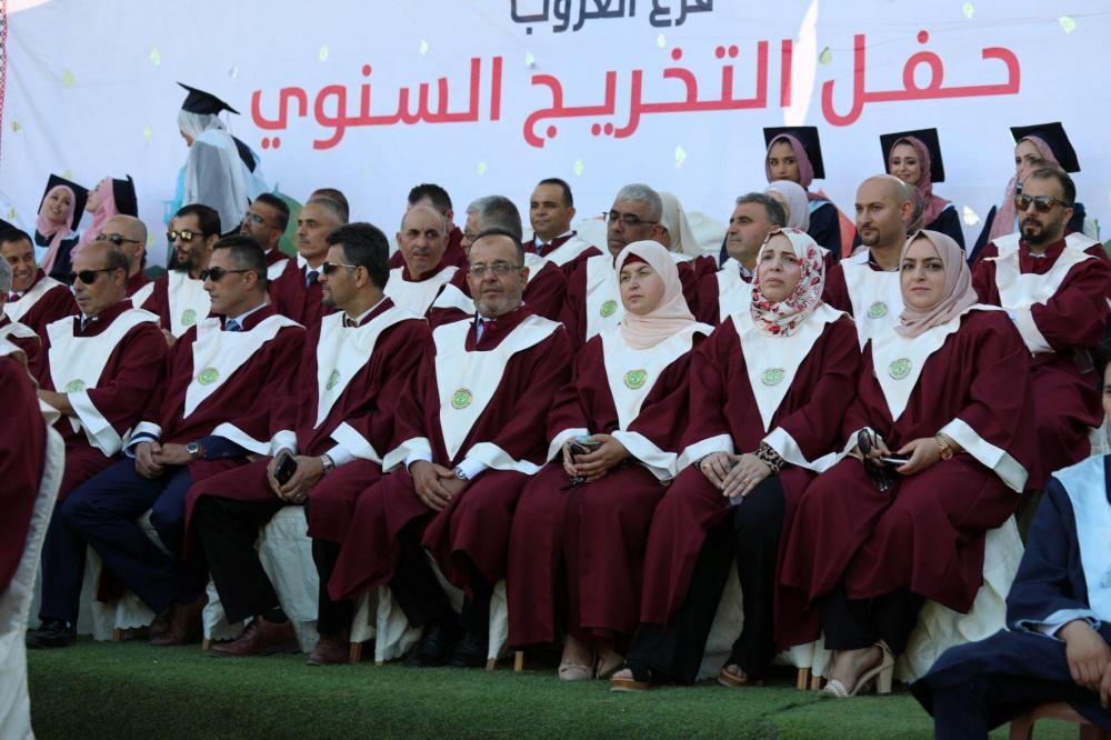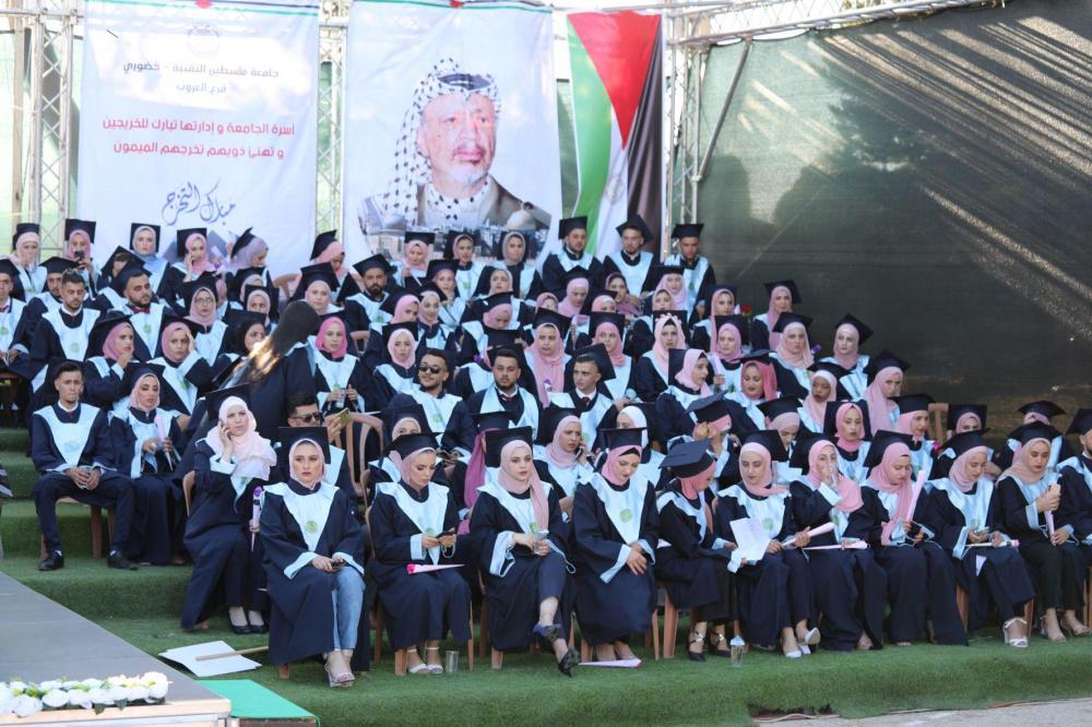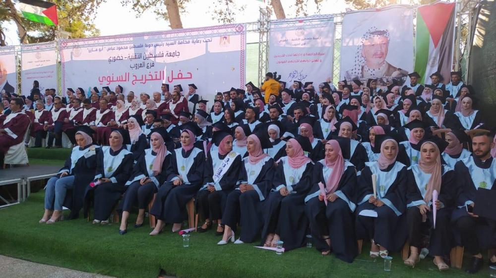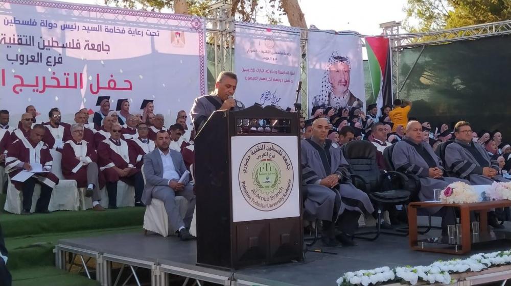 احتفلت جامعة فلسطين التقنية-خضوري، اليوم بتخريج الفوجين الثالث والرابع لفرع الجامعة في العروب، والفوجين الثالث عشر والرابع عشر من طلبة الجامعة تحت مسمى فوج "الثبات والتحدي"، الذي يأتي تعبيراً عن التمسك بالثوابت والصمود على الأرض، والمضي قدما في خوض التحديات، والثبات، والرباط، المتمحور على بناء الإنسان والشباب وتمكينهم باعتبارهم رأس المال الدائم الذي يجب تسليحه بالعلم والأمل والتحدي والمعرفة، حيث احتفلت الجامعة في فرعها بالعروب بتخريج 378 طالبة وطالبة من حملة درجة البكالوريوس من كلية الآداب والعلوم التربوية، وكلية الأعمال والاقتصاد، وكلية العلوم التطبيقية، وكلية مجتمع فلسطين التقنية- الدبلوم.