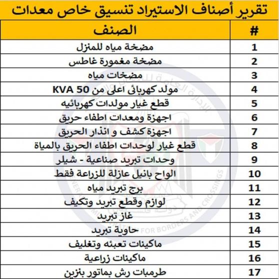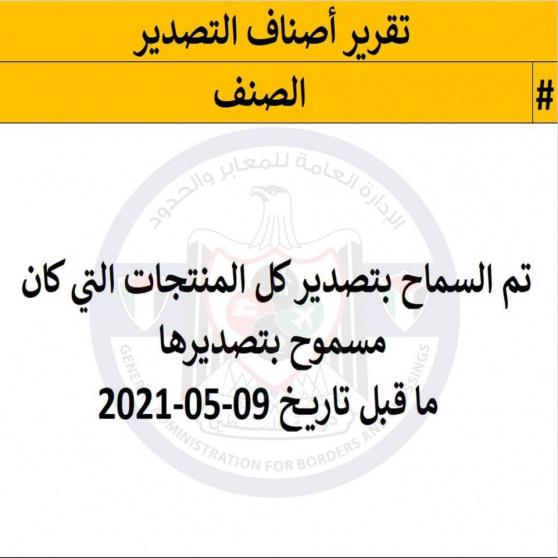 قالت اللجنة الرئاسية لتنسيق البضائع التابعة للسلطة الفلسطينية اليوم الثلاثاء إن الجانب الإسرائيلي أبلغها بالسماح باستيراد وتصدير عدد من السلع اعتبارا من يوم الخميس المقبل الموافق 19/8/2021.