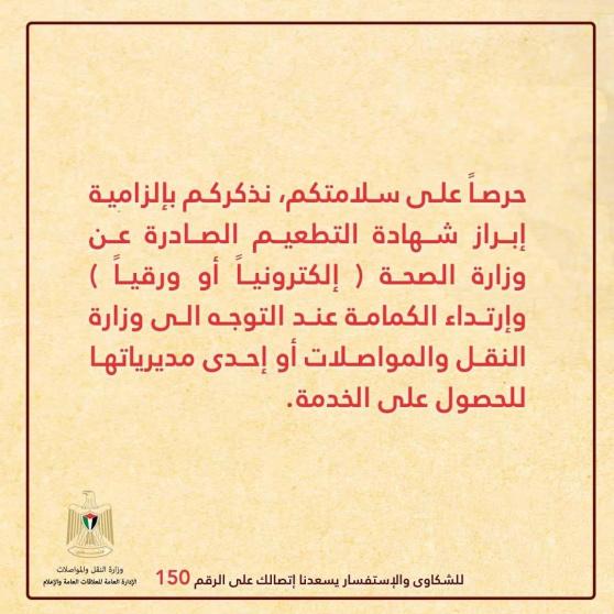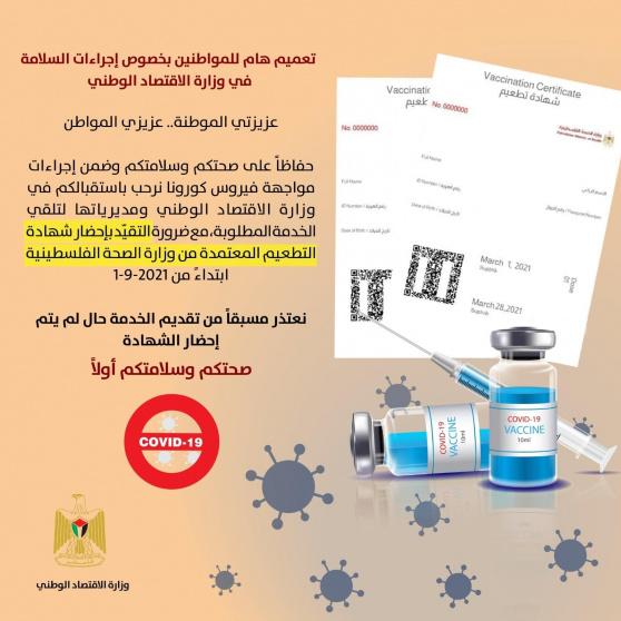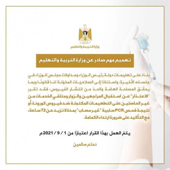 وقررت وزارات فلسطينية وهي التربية والتعليم والاقتصاد الوطني والنقل والمواصلات الاعتذار عن تقديم خدماتها للجمهور والمستفيدين غير المطعمين ، مؤكدة انها ستقدم خدماتها فقط لكل من يبرز شهادة التطعيم.