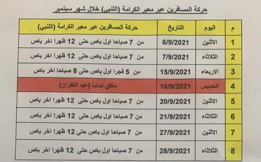 أعلنت الإدارة العامة للمعابر والحدود الفلسطينية أن معبر الكرامة سيعمل يوم الأربعاء، من الساعة 5 فجرا حتى الساعة 8 صباحا في كلا الاتجاهين ، ويوم الخميس المعبر مغلق إغلاق تام بسبب الاعياد اليهودية .