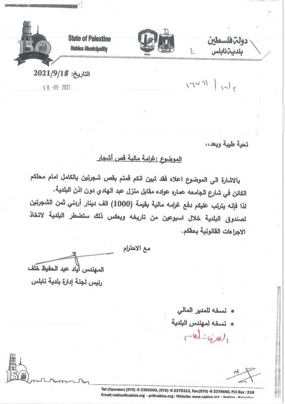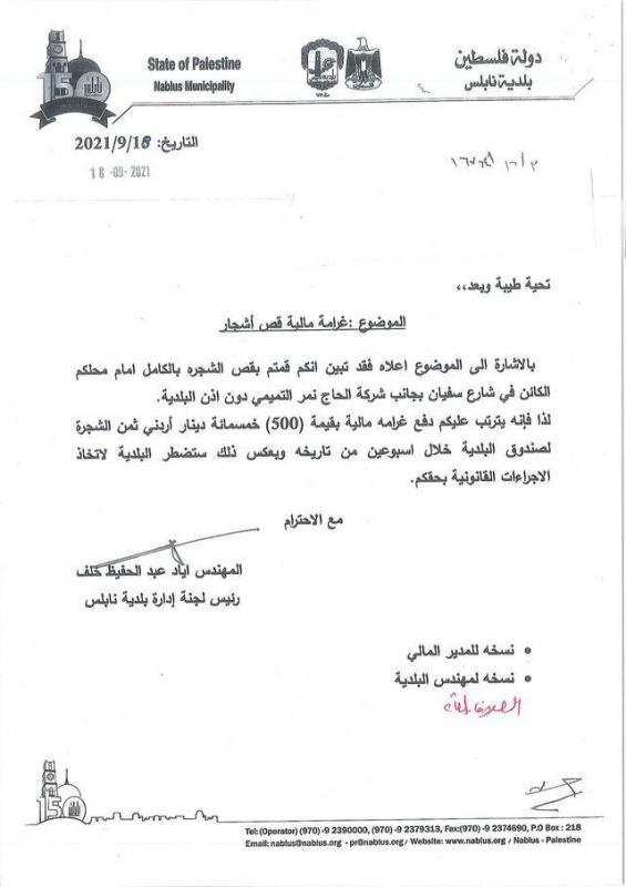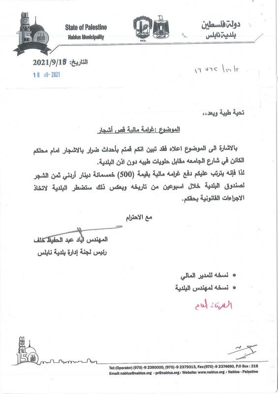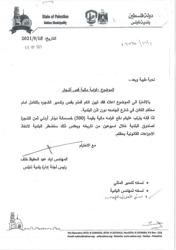 أعلنت بلدية نابلس مساء اليوم الاثنين، أنها قامت خلال الأيام القليلة الماضية، بتحرير عدد من المخالفات لبعض المواطنين الذي قاموا بقطع الأشجار المزروعة على الأرصفة بدون أي سبب.