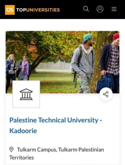 دخلت جامعة فلسطين التقنية خضوري في طولكرم، ولأول مرة في تاريخها التصنيف الدولي "QS" للجامعات العربية، ما سيمكنها من المشاركة في التصنيف الدولي على المستوى العالمي، ويدخلها ضمن إطار الجامعات العالمية المتميزة التي سيتم الإعلان عن تفاصيلها في مؤتمر سيعقد في الـ13 من الشهر المقبل في دبي.