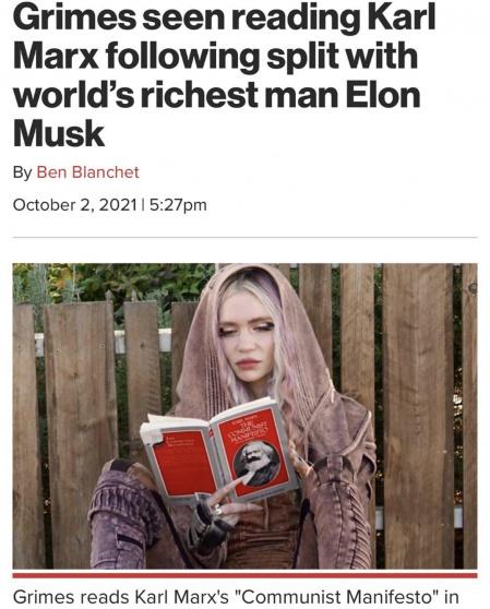 انتشرت صور للمغنية الكندية غرايمز، طليقة أغنى رجل في العالم، إيلون ماسك، وهي تجلس على الرصيف في أحد شوارع لوس أنجلوس وتقرأ كتابا لكارل ماركس.