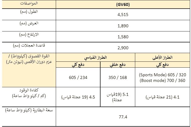 وبالنسبة للسائقين الذين يبحثون عن تجربة قيادة أكثر متعة، تم تزويد سيارة (GV60) أيضاً بوضعية الدريفت (Drift Mode)، التي توفر أعلى مستويات القيادة الرياضية من خلال تحسين توزيع قوة القيادة ونظام الكبح.