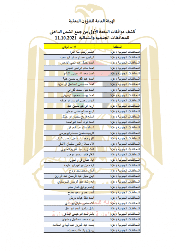 وقالت الهيئة في بيان لها نشرته عبر صفحتها الرسمية على "فيس بوك"، "لاحقاً للبيان الصادر عن الوزير حسين الشيخ حول آخر المستجدات في ملف شمل العائلات وتغيير العنوان ،، ننشر لكم كشف موافقات الدفعة الاولى من جمع الشمل الداخلي للمحافظات الجنوبية والشمالية - 11-10-2021".