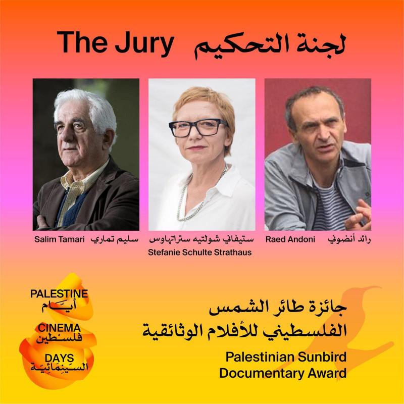 وتضم لجنة تحكيم مسابقة الأفلام الوثائقية الطويلة: منسقة معهد آرسنال للسينما وفن الفيديو ستيفاني شولتيه ستراهاوس، والمخرج والمنتج الفلسطيني رائد أنضوني، والباحث والأكاديمي واستاذ علم الاجتماع سليم تماري.