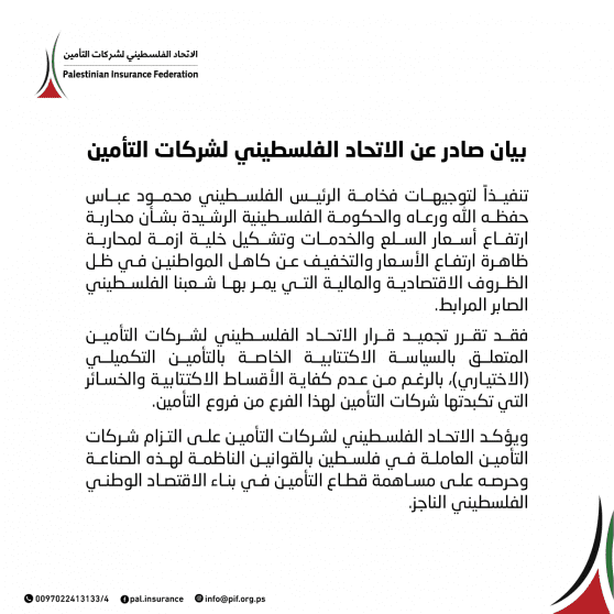قال الاتحاد الفلسطيني لشركات التأمين، إنه قرر تجميد قرار الاتحاد المتعلق بالسياسة الاكتتابية الخاصة بالتأمين التكميلي (الاختياري)، وذلك تنفيذاً لتوجيهات الرئيس محمود عباس، والحكومة الفلسطينية بشأن محاربة ارتفاع أسعار السلع والخدمات وتشكيل خلية ازمة لمحاربة ظاهرة ارتفاع الأسعار والتخفيف عن كاهل المواطنين في ظل الظروف الاقتصادية والمالية التي يمر بها شعبنا الفلسطيني الصابر المرابط.