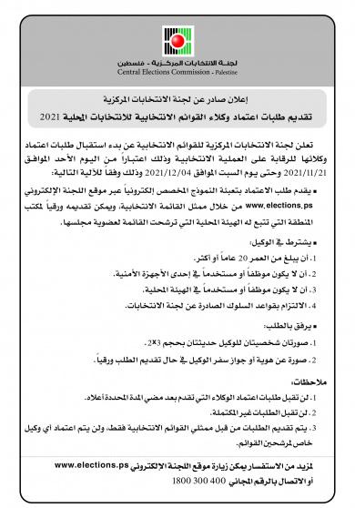 أصدرت لجنة الانتخابات المركزية مساء يوم الخميس، بياناً أعلنت من خلاله بدء استقبال طلبات اعتماد وكلاء القوائم الانتخابية للانتخابات المحلية.