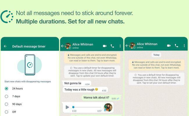 بالإضافة إلى ذلك تمنح واتساب المستخدمين خيار إخفاء الرسائل بعد مرور 24 ساعة و 90 يومًا، بالإضافة إلى فترة الأيام السبعة التي قدمتها مع الميزة في الأصل في العام الماضي.