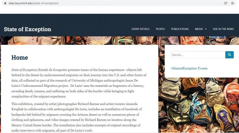 ويتضمن المعرض تركيبا فنيا لمئات حقائب الظهر، التي خلفها مهاجرون عبروا صحراء أريزونا، عند الحدود المكسيكية الأمريكية.