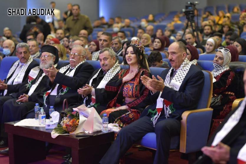 ورحبت عريفة الحفل الإعلامية ميس حسون بالجمهور العريض فقد لبيتم دعوتنا لحضور هذا الكرنفال الوطني .. فمرحباً بكم وأنتم تتوشحون بالكوفية الفلسطينية وأنتن تلبث الثوب الفلسطيني ليكون ردنا اليوم على ما يسمى ملكة جمال الكون في كيان الاحتلال ، ولنقول للعالم هذا تراثنا وهذا ثوبنا وهذه هويتنا وأنتم ايها الدخلاء لا تراث ولا هوية لكم أيها العابرون بين الكلمات العابرة .