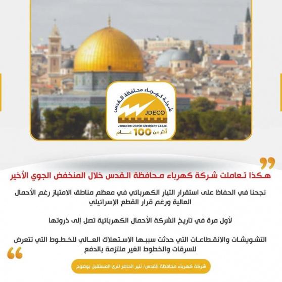 أكدت شركة كهرباء محافظة القدس أنها بذلت كل جهد يلزم للحفاظ على استقرار التيار الكهربائي خلال المنخفض الجوي الأخير، وهو الأعمق منذ بداية فصلي الخريف والشتاء، حيث وصلت فيه الأحمال (مساء يوم الثلاثاء الماضي) إلى 608 ميجا واط وهو الأعلى في تاريخ الشركة.