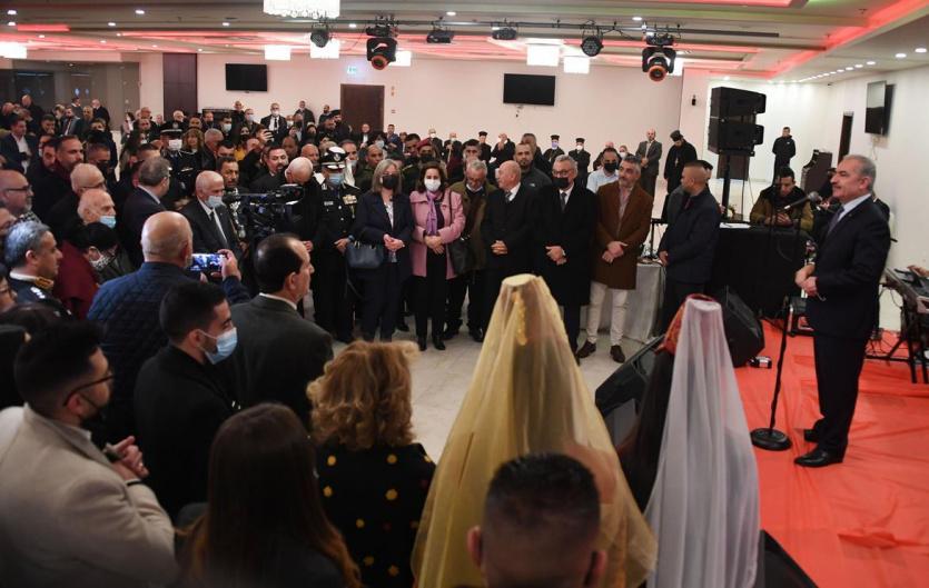 واستهل اشتية حديثه بالقول : "اليوم بيت لحم تحتفل بعيد الميلاد المجيد، وترسل رسالة للعالم أن هذه المدينة هي قبلة المسيحيين، وتؤكد أن شعبنا يريد السلام ويمد يده للسلام، السلام المبني على الحق والعدل والذي يعيد الحقوق لأصحابها، وينهي الاحتلال، وتقام دولتنا المستقلة".