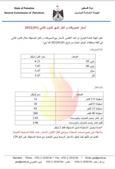 وبينت الهيئة أن لتر البنزين 95 يباع بـ6.21 شيقل، ولتر البنزين 98 بـ7.07 شيقل، ولتر السولار والكاز بـ5.47 شيقل.