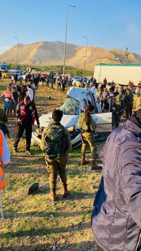 من مكان حادث السير المروع الذي أودى بحياة 7 مواطنين#شاهد من مكان حادث السير المروع الذي أودى بحياة 7 مواطنين فلسطينيين قرب قرية فصايل شمال أريحا، مروحيتان تشاركان في عمليات الإنقاذ