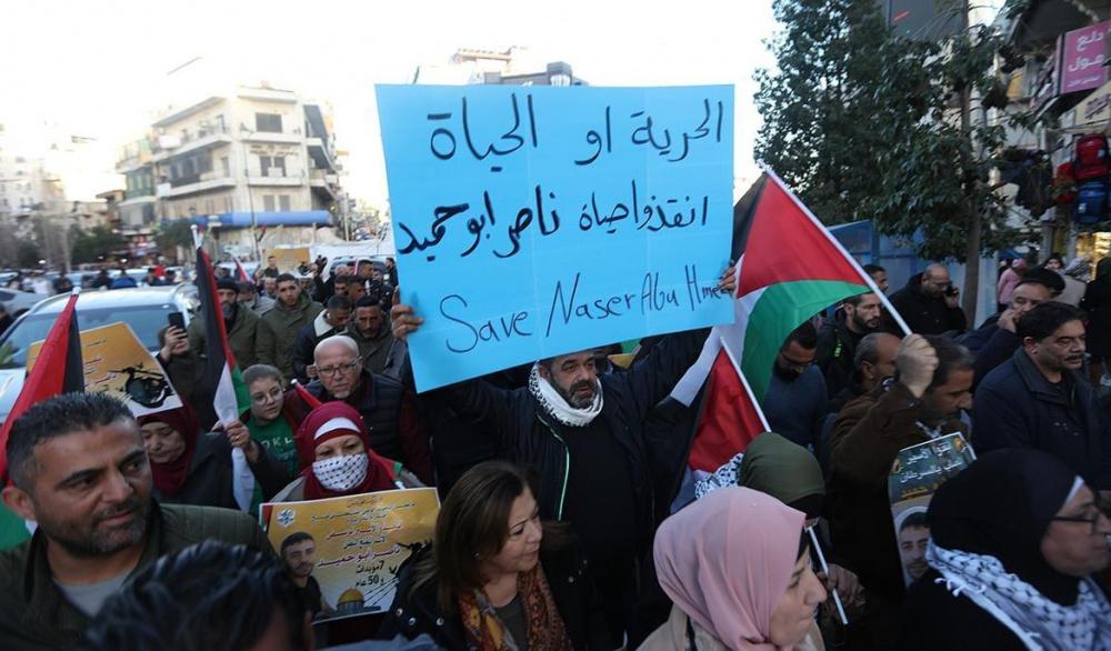 شارك مواطنون، مساء الاثنين، في وقفة ومسيرة دعم واسناد للأسير المريض ناصر أبو حميد، الذي يعيش ظروفا صحية صعبة تهدد حياته، خاصة بعد دخوله في حالة غيبوبة منذ الثلاثاء الماضي.