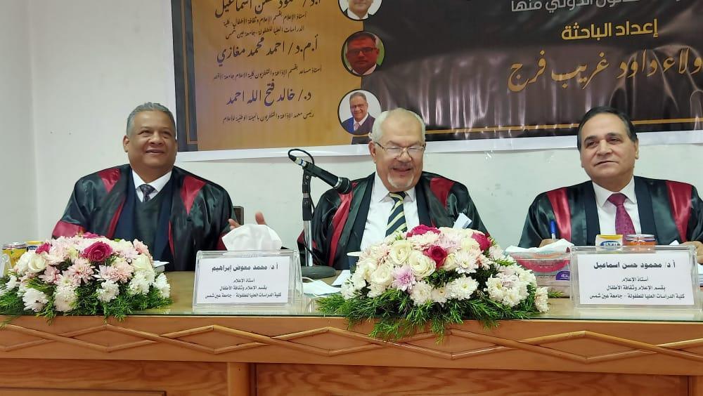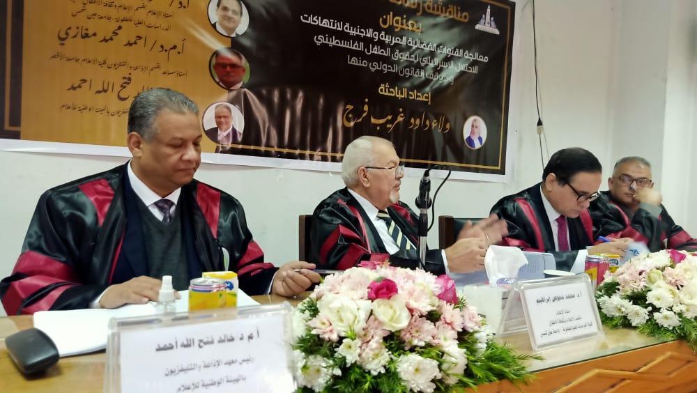 وقد كانت مناقشة علمية رائعة حسب وصف الحضور، حيث قدمت البطاط عرضاً مميزاً ملخصاً لدراستها ، فلم تتخلى البطاط في المناقشة عن دورها الاعلامي والذي من خلاله استعانت بالفيديوهات التي توثق الانتهاكات الاسرائيلية لحقوق الطفل الفلسطيني وكيفية معالجة القنوات الفضائية العربية والاجنبية لهذه الانتهاكات، وقد وصف المشرف الرئيس على الرسالة الاستاذ الدكتور محمود اسماعيل استاذ الاعلام وثقافة الاطفال الرسالة من اهم الرسائل العلمية التي قام بالإشراف عليها مؤكداً على اهمية ان يكون الباحث صاحب رسالة ويسعى الى خدمة مجتمعه كما سعت وتسعى الباحثة ولاء بطاط ، كما اكد الاستاذ الدكتور محمد معوض استاذ الاعلام وثقافة الاطفال ورئيس لجنة الحكم والمناقشة ان الدراسة عكست جهداً كبيراً وواضحاً اضافة الى اهميتها التي ستنعكس على الاعلاميين والباحثين الذين سيقومون بالاطلاع عليها فيما بعد مما تحمله من اهمية.