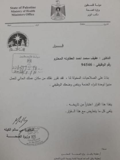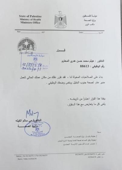 يأتي ذلك في نص القرار، الذي قالت فيه الوزارة: "بناء على الصلاحيات المخولة لنا فقد تقرر نقلك من مكان عملك الحالي للعمل مدير عام لصحة جنوب الخليل وبنفس وضعك الوظيفي".
