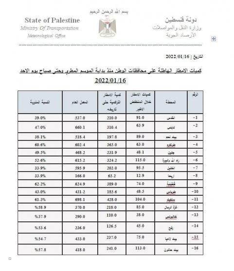 أعلنت دائرة الارصاد الجوية الفلسطينية، اليوم الأحد، عن كميات الأمطار التي هطلت على كافة محافظات الوطن منذ بداية الموسم المطري وحتى صباح يوم 16/01/2022.