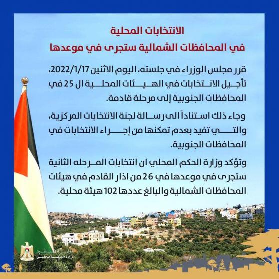 قرر مجلس الوزراء في جلسته، الاثنين، تأجيل الانتخابات في الهيئات المحلية في المحافظات الجنوبية (قطاع غزة) والبالغ عددها 25 هيئة؛ إلى مرحلة قادمة.