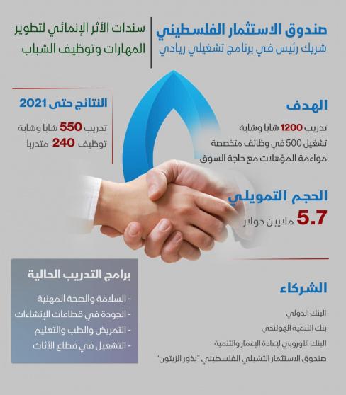 أعلن صندوق الاستثمار الفلسطيني عن مجموعة من النتائج الإيجابية التي حققها برنامج "سندات الأثر الإنمائي" لتطوير المهارات وتوظيف الشباب حتى نهاية العام 2021، والتي تمثّلت في تدريب 550 من الشباب الفلسطيني في برامج تدريبية متقدّمة تلائم حاجة السوق، وتوظيف 240 منهم في وظائف متخصصة كمرحلة أولى.