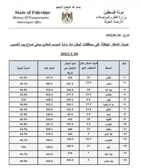 أعلنت دائرة الارصاد الجوية الفلسطينية، الخميس، عن كميات الأمطار التي هطلت على كافة محافظات الوطن منذ بداية الموسم المطري وحتى صباح اليوم 20/01/2022.