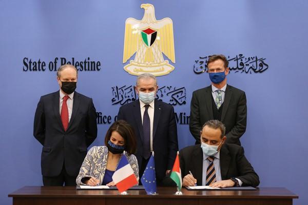 وجرى توقيع الاتفاقيات، اليوم الأربعاء، في مكتب رئيس الوزراء محمد اشتية بمدينة رام الله، برعايته وحضوره، لتعزيز الاقتصاد الفلسطيني ودعم الاستثمار في الطاقة المتجددة، ودعم وتمويل الشركات الصغيرة والمتوسطة المتضررة من جائحة "كورونا".