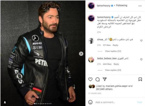 نشر الفنان المصري تامر حسني صورة جديدة له عبر حسابه الخاص على تطبيق تبادل الصور (إنستغرام) أثارت الجدل الكبير بين متابعيه، بسبب تغير ملامحة وتسريحة شعره، في آخر ظهور له في حفل فورمولا إي في المملكة العربية السعودية.