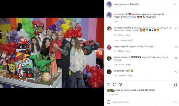 و نشرت نانسي عجرم صورتين من عيد الميلاد الذي نظمته، حيث ظهرت الأسرة بأكملها، نانسي وزوجها طبيب الأسنان فادي الهاشم وابنتيها ميلا وإيلا، وعلقت على الصور قائلة: "كل سنة وإنتي فرحة البيت و دقات قلبه".