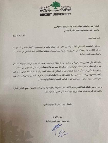 وكانت الكتل الطلابية في جامعة بيرزيت أكدت على تمسكها بتحقيق كافة مطالبها التي تقدمت بها لإدارة الجامعة بما فيها إقالة القائم بأعمال عميد شؤون الطلبة ونائب الرئيس لشؤون التنمية والاتصال، وستواصل خطواتها التصعيدية بما فيها الإضراب المفتوح عن من أجل تحقيق مطالبها كاملة.