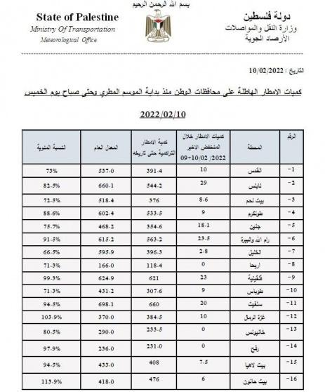 أعلنت دائرة الارصاد الجوية الفلسطينية، اليوم الخميس، عن كميات الأمطار الهاطلة على كافة محافظات الوطن خلال المنخفض الجوي الاخير ومنذ بداية الموسم المطري وحتى صباح اليوم 10/02/2022.
