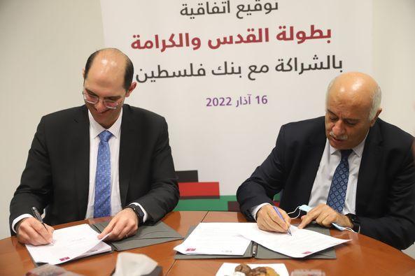 القدس- دائرة الإعلام بالاتحاد- وقّع رئيس الاتحاد الفلسطيني لكرة القدم، الفريق جبريل الرجوب، ومدير عام بنك فلسطين، محمود الشوا، اليوم الأربعاء، اتفاقية رعاية لبطولة القدس والكرامة، المقرر انطلاقها يوم السبت 19/03/2022.