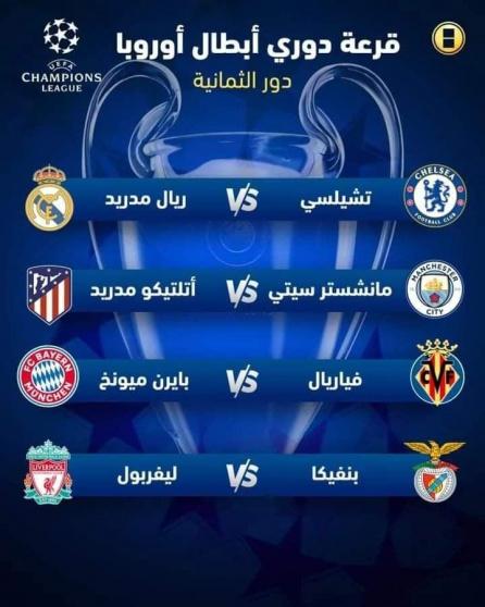 ورأفت القرعة بحال ليفربول الإنجليزي، وأوقعته أمام بنفيكا البرتغالي، بينما سيواجه مانشستر سيتي الإنجليزي أتلتيكو مدريد الإسباني، وسيواجه بايرن ميونيخ الألماني خصمه فياريال الإسباني.