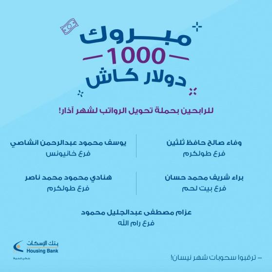 أعلن بنك الإسكان عن أسماء الرابحين في جوائز حملته خلي راتبك إسكان والمخصصة للعملاء الذين يحولون رواتبهم على البنك، حيث ربح في الشهر الأول من الحملة كل من وفاء صالح حافظ ثلثين وهنادي محمود محمد ناصر من فرع طولكرم وعزام مصطفى محمود من فرع رام الله ويوسف محمود انشاصي من فرع خانيونس وبراء شريف حسان من فرع بيت لحم مبلغ 1000 دولار لكل منهم، هذا وقد أطلق بنك الإسكان حملته لاستقطاب رواتب العملاء، والتي تتضمن مجموعة من المزايا والعروض التمويلية وذلك حرصا منه على توسيع قاعدة عملائه ومكافأتهم على اختيارهم بنك الإسكان.