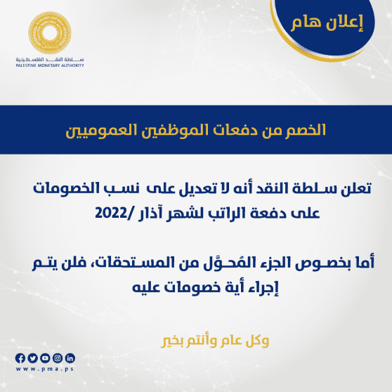 أعلنت سلطة النقد، اليوم الثلاثاء، أنه لا تعديل على نسب الخصومات على دفعة الراتب لشهر آذار/ 2022.