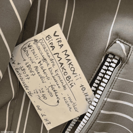 وشاركت ساشا صورة ثانية لبطاقة اتصال مكتوبة بخط اليد وموضوعة في سترة فيرا، تظهر أسماء والديها وأرقام هواتفهما في حال تفرقت بهم السبل.