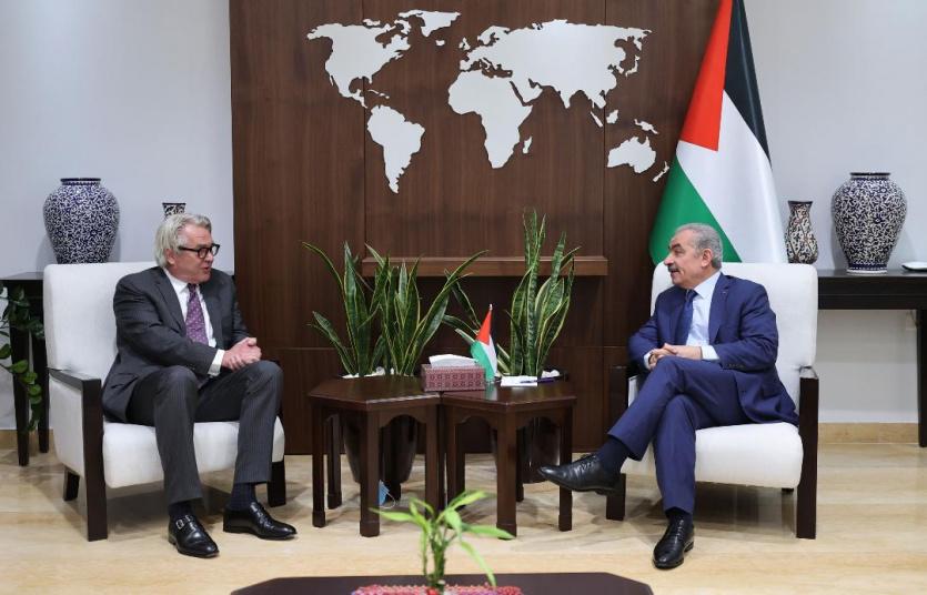 بحث رئيس الوزراء محمد اشتية مع المنسق الخاص للأمم المتحدة لعملية السلام في الشرق الأوسط تور وينسلاند، آخر التطورات السياسية ومستجدات الأوضاع، وتأثير الأحداث الجارية في العالم على فلسطين.