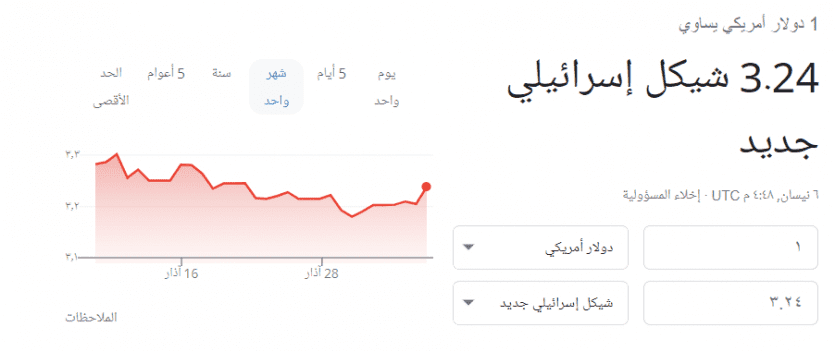 شهد سعر صرف الدولار مقابل الشيكل، مساء اليوم الأربعاء 5 أبريل 2022، ارتفاعا جديدا بشكل ملحوظ في التداولات المصرفية المسائية، مقارنة بما كان عليه في ساعات الصباح الأولى.