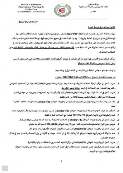 وقرر مجلس النقابة في بيان له، الإضراب الشامل في مراكز الرعاية الصحية يوم غد الأربعاء مع عدم التوجه، ويشمل ذلك مدراء التمريض و التمريض العاملين على الاستراحة في أريحا مراكز فحص كورورنا.